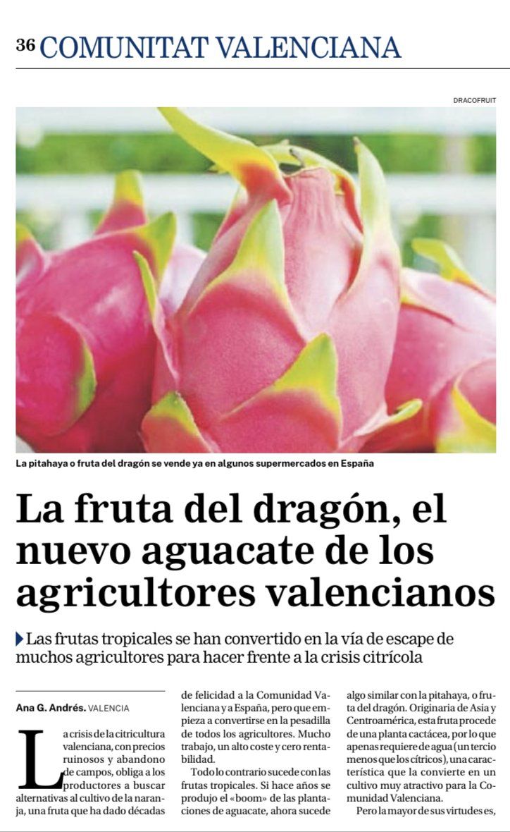 La fruta del dragón, el nuevo aguacate de los agricultores valencianos. las frutas tropicales se han convertido en la vía de escape de muchos agricultores para hacer frente a la crisis citrícola. La crisis de la citricultura valenciana, con precios ruinosos y abandono de campos, obliga a los productores a buscar alternativas al cultivo de la naranja, una fruta que ha dado décadas de felicidad a la Comunidad Valenciana y a España, pero que empieza a convertirse en la pesadilla de todos los agricultores. Mucho trabajo, un alto coste y cero rentabilidad. Todo lo contrario sucede con las frutas tropicales. Si hace años se produjo el «boom» de las plantaciones de aguacate, ahora sucede algo similar con la pitahaya, o fruta del dragón. Originaria de Asia y Centroamérica, esta fruta procede de una planta cactácea, por lo que apenas requiere de agua (un tercio menos que los cítricos), una carac- terística que la convierte en un cultivo muy atractivo para la Comunidad Valenciana. Pero la mayor de sus virtudes es, sin duda, el buen precio de mercado. Un kilo de esta fruta se paga a cinco o seis euros, muy lejos de los diez céntimos que cobra un citricultor por la misma cantidad de naranjas. En la Comunidad Valenciana el interés entre los agricultores por adquirir esquejes de esta planta y probar suerte es cada vez mayor. Por el momento, ya existe una empresa que se dedica de forma profesional y en exclusiva a la producción, venta y comercialización de esquejes de la pitahaya. Se trata de Dracofruit, propiedad de los her- manos Mireia y Salvador Morera. Ubicados en la comarca de La Safor (Valencia) y de familia agricultora, ambos hacía tiempo que venían pensando en darle una vuelta a los cultivos de toda la vida y dedicarlos a algo distinto y con más salida. Una de las caracterís- ticas que más les atrajo fue la poca necesidad de agua que tiene esta planta, ya que de esta forma puede ser un cultivo muy sostenible. El año pasado fue el primero en el que comercializaron la fruta y los esquejes, y el interés ha sido «brutal», asegura Mireia. La venta de esquejes experimentó el año pasado una subida del 60 por cien- to y para esta campaña esperan un resultado aún mejor. Por lo que respecta a la comercialización del fruto, Morera asegura que la fruta del dragón es aún bastante desconocida en España, y se vende sobre todo en países europeos como Francia, Holanda y Alemania, donde está ganando adeptos debido a sus propiedades nutricionales. En España, aunque se vende en algunos supermercados, la calidad es mediocre, puesto que la importan de países lejanos, por lo que ha sido recolectada antes de tiempo. Por el momento, aparte de en la Comunidad Valenciana, se está empezando a cultivar también en otras autonomías como Galicia y Cataluña.