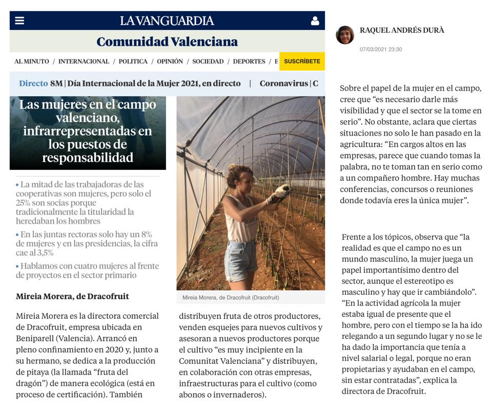 La fruta del dragón, el nuevo aguacate de los agricultores valencianos. las frutas tropicales se han convertido en la vía de escape de muchos agricultores para hacer frente a la crisis citrícola. La crisis de la citricultura valenciana, con precios ruinosos y abandono de campos, obliga a los productores a buscar alternativas al cultivo de la naranja, una fruta que ha dado décadas de felicidad a la Comunidad Valenciana y a España, pero que empieza a convertirse en la pesadilla de todos los agricultores. Mucho trabajo, un alto coste y cero rentabilidad. Todo lo contrario sucede con las frutas tropicales. Si hace años se produjo el «boom» de las plantaciones de aguacate, ahora sucede algo similar con la pitahaya, o fruta del dragón. Originaria de Asia y Centroamérica, esta fruta procede de una planta cactácea, por lo que apenas requiere de agua (un tercio menos que los cítricos), una carac- terística que la convierte en un cultivo muy atractivo para la Comunidad Valenciana. Pero la mayor de sus virtudes es, sin duda, el buen precio de mercado. Un kilo de esta fruta se paga a cinco o seis euros, muy lejos de los diez céntimos que cobra un citricultor por la misma cantidad de naranjas. En la Comunidad Valenciana el interés entre los agricultores por adquirir esquejes de esta planta y probar suerte es cada vez mayor. Por el momento, ya existe una empresa que se dedica de forma profesional y en exclusiva a la producción, venta y comercialización de esquejes de la pitahaya. Se trata de Dracofruit, propiedad de los her- manos Mireia y Salvador Morera. Ubicados en la comarca de La Safor (Valencia) y de familia agricultora, ambos hacía tiempo que venían pensando en darle una vuelta a los cultivos de toda la vida y dedicarlos a algo distinto y con más salida. Una de las caracterís- ticas que más les atrajo fue la poca necesidad de agua que tiene esta planta, ya que de esta forma puede ser un cultivo muy sostenible. El año pasado fue el primero en el que comercializaron la fruta y los esquejes, y el interés ha sido «brutal», asegura Mireia. La venta de esquejes experimentó el año pasado una subida del 60 por cien- to y para esta campaña esperan un resultado aún mejor. Por lo que respecta a la comercialización del fruto, Morera asegura que la fruta del dragón es aún bastante desconocida en España, y se vende sobre todo en países europeos como Francia, Holanda y Alemania, donde está ganando adeptos debido a sus propiedades nutricionales. En España, aunque se vende en algunos supermercados, la calidad es mediocre, puesto que la importan de países lejanos, por lo que ha sido recolectada antes de tiempo. Por el momento, aparte de en la Comunidad Valenciana, se está empezando a cultivar también en otras autonomías como Galicia y Cataluña.
